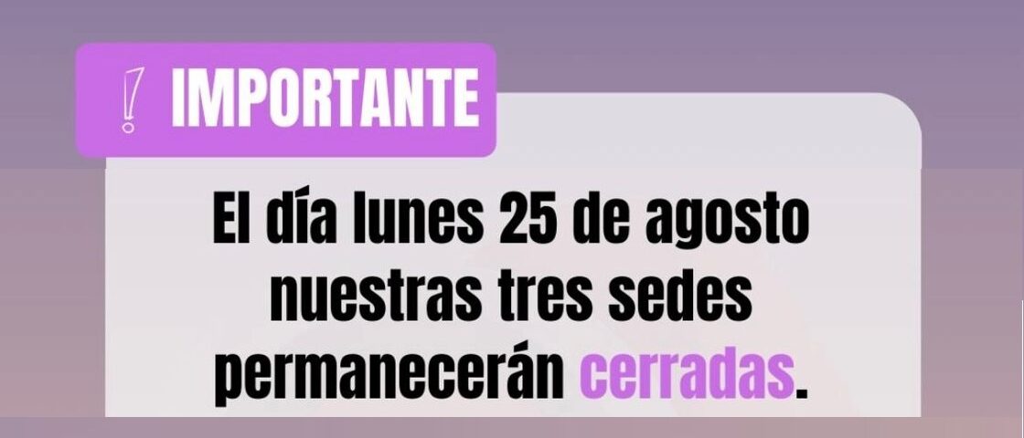 El día 25 de agosto nuestras tres sedes permaneceran cerradas debido al feriado provincial por el aniversario de la fundación de la provincia.